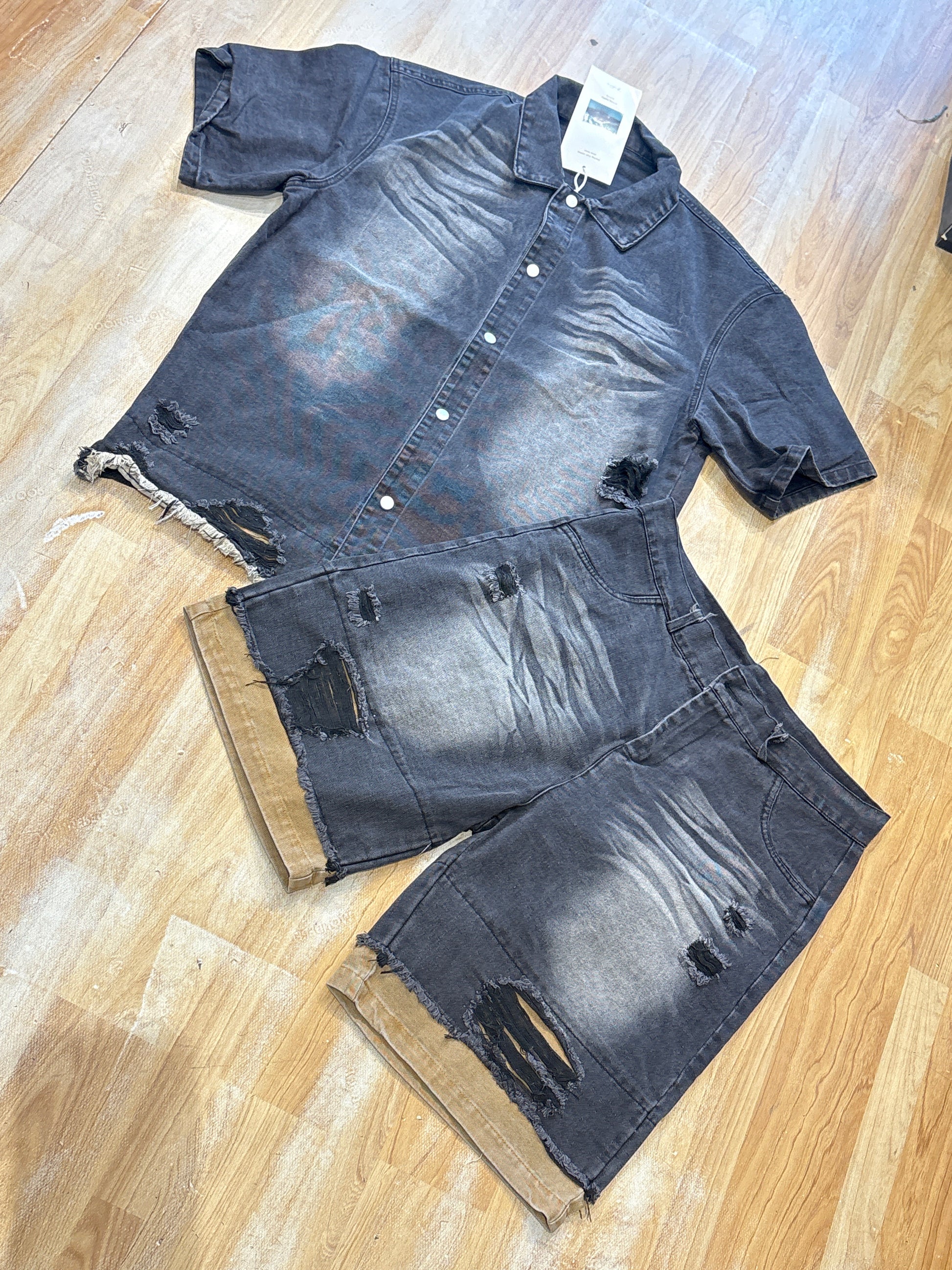 Black Grey Rugged Half Sleeve Shirt With Shorts Denim Coord Set 7723