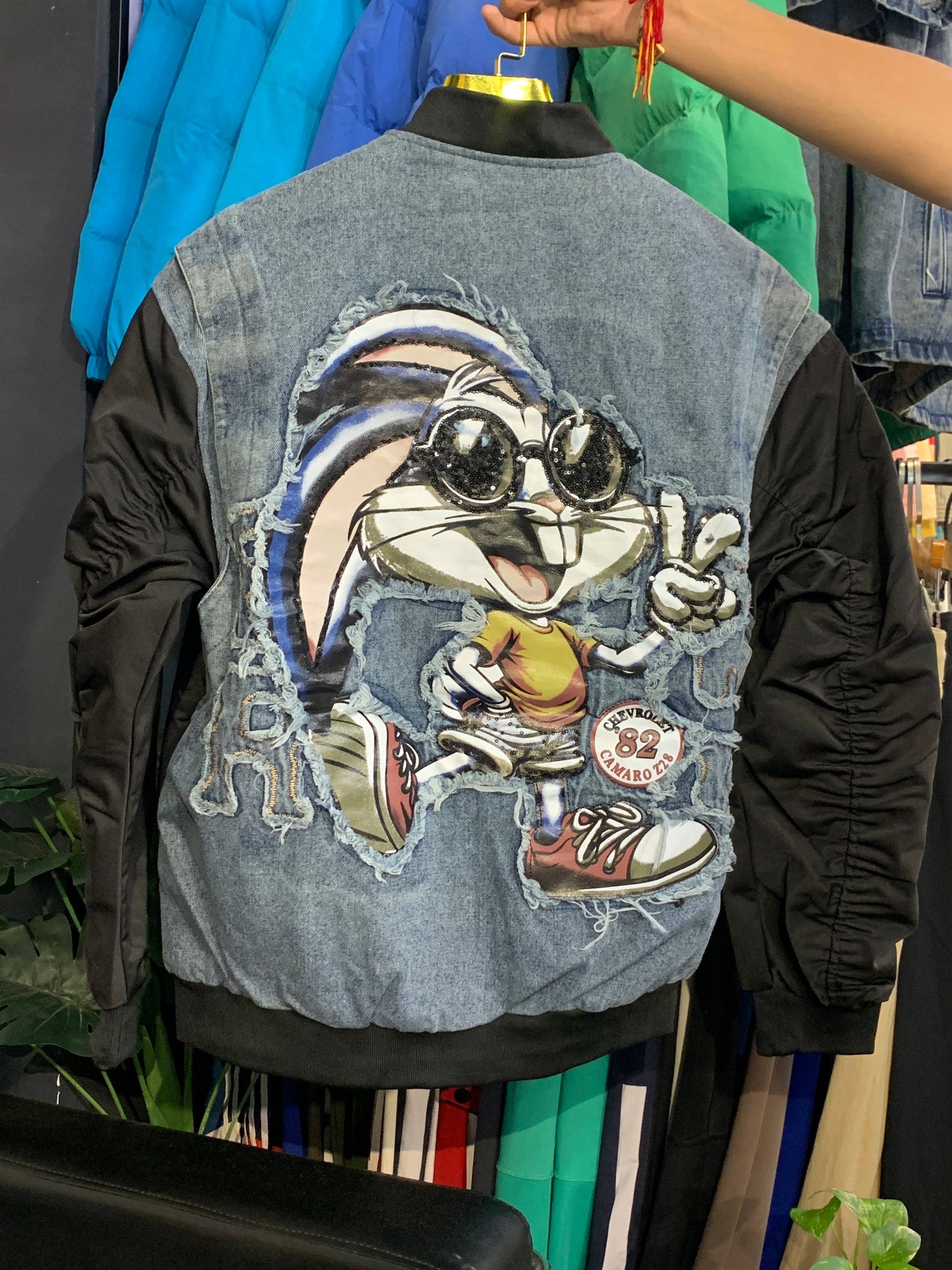 BCLEIN Black Colour With Rugged Blue Denim Embroidery Back Print Premium Quality Unisex Varsity Jacket 017
